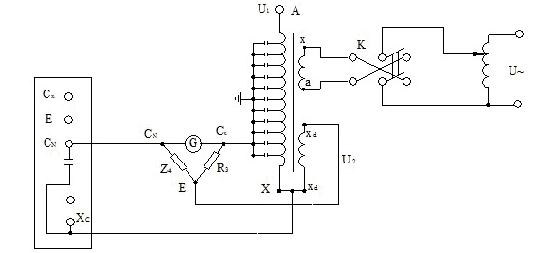 如圖1-2所示,利用QS1型橋體內(nèi)的標(biāo)準(zhǔn)電容做電橋的標(biāo)準(zhǔn)臂,對(duì)串級(jí)式互感器進(jìn)行自激測(cè)量tanδ值。