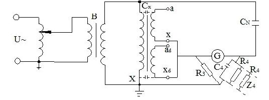 如圖1-3所示,同樣可以利用QS1型高壓電橋進(jìn)行測(cè)量,并需用高壓試驗(yàn)變壓器B,在被試電壓互感器的高壓側(cè)激磁,同時(shí)供給電橋電源。低壓末端接地,低壓繞組也處于較低電位,這樣基本上避免了小套管因受潮和臟污對(duì)測(cè)量值的影響??梢姡┒似帘畏ǖ慕泳€只能測(cè)出和低壓繞組及輔助繞組直接耦合的高壓繞組部分的tanδ值。末端屏蔽法同樣有電源系統(tǒng)和外界電場(chǎng)的干擾問題,其防止措施和自激法相同。