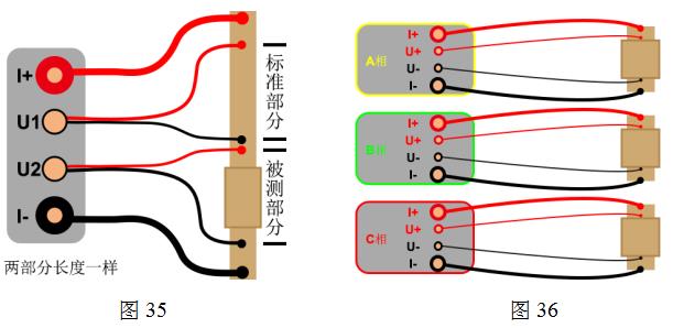 選型二相測試時,一般為導(dǎo)體電阻專用測試儀,用來檢測電線電纜等接頭,要求等距含接頭部分的電阻要小于等距不含接頭部分的電阻,儀器自動產(chǎn)生兩者之間的電阻的比較值。電流一般是共用的,電壓改為兩個二芯航插。有專用電阻測試夾具(選配)更方便保證兩個部分的距離,也方便標(biāo)定距離的長度和截面積。如圖35: