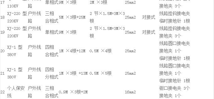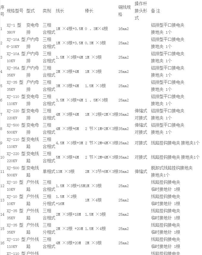 XJ系列攜帶式三相短路接地線配置表型號、規(guī)格: